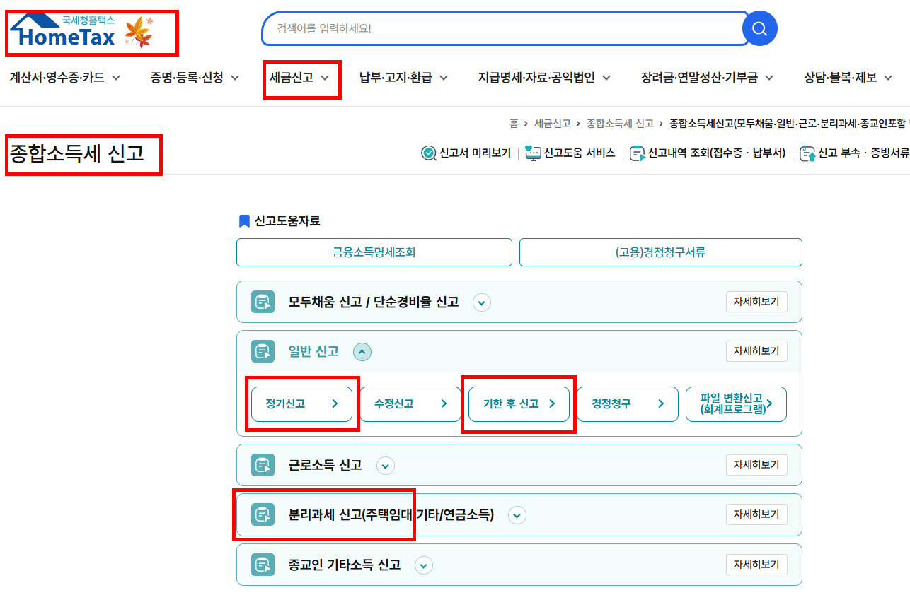 2️⃣ 신고/납부 메뉴 선택 : 상단의 ‘신고/납부’ 메뉴를 클릭하고, ‘종합소득세’를 선택한 후 ‘정기신고’ 또는 ‘기한 후 신고’ 중 본인에게 해당되는 항목을 선택해요.